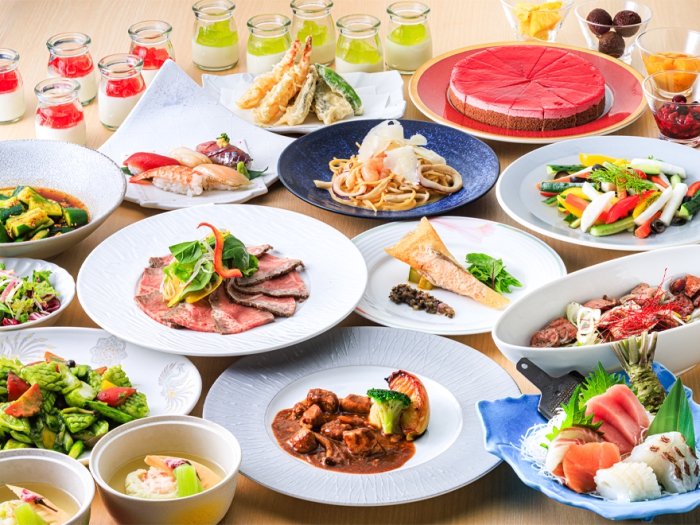 刺身、寿司、グリル料理、鉄板料理、洋食、中華などのメニューを、ブッフェスタイルでお召し上がりください。