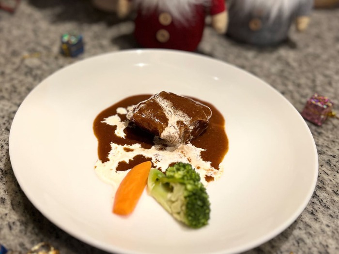 シェフが3時間コトコトコトコトにじっくり煮込んだ牛のもも肉(国産)は、脂肪が少なく赤身はサッパリとしていながらもホロッとほどけ、じんわり染み込んだデミグラスソースとお肉の旨みが絶妙です!