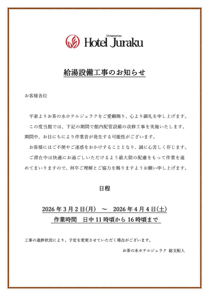 お茶の水ホテルジュラクの館内をご案内いたします。